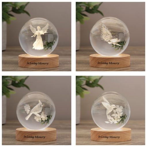 Crystal Keepsakes feature a crystal orb with a wood base and built in LED Lights. There’s a 4 1/2′ USB cord with an ON/OFF switch. These are gift boxed!