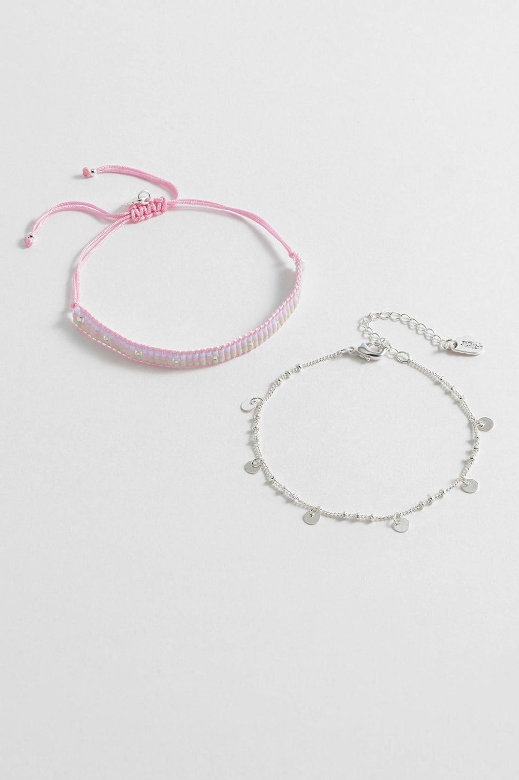 The pink bracelet measures 25.5cm with an adjustable strap; the silver bracelet measures 21.5cm.