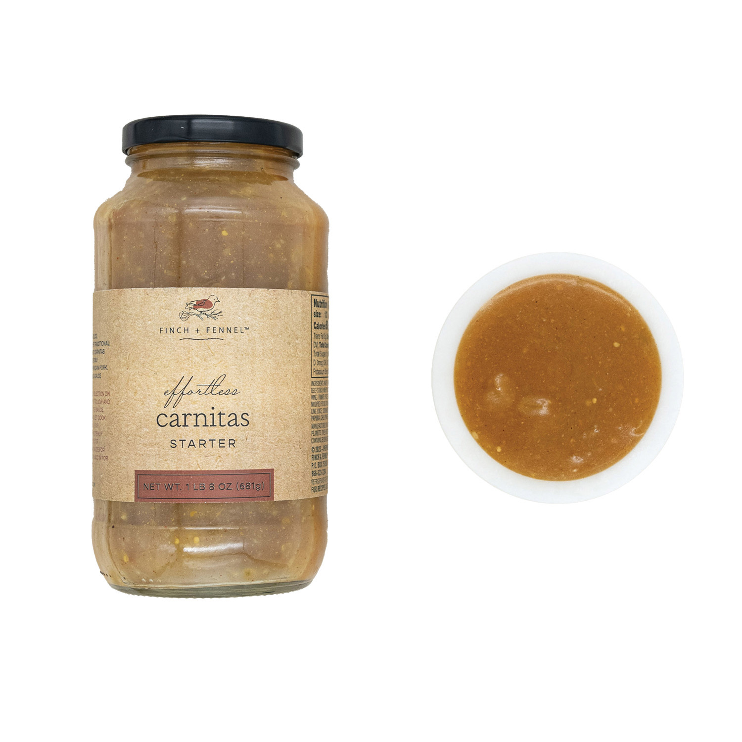 Effortless Carnitas Starter: By combining tomatillos, jalapenos and other traditional spices, this authentic Effortless Carnitas Starter creates incredibly flavorful, tender Mexican pork. Also try it as an enchilada sauce as well! Click here for recipes + product uses!