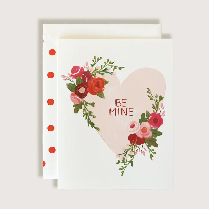 Blush/Peach Heart adorned with bright, dark and soft red and pink florals. A2 size. 4.25 x 5×5 folded card. Cream Card stock. Cream Envelope. Red polka dotted liner on cream. Cello Sleeve provided.