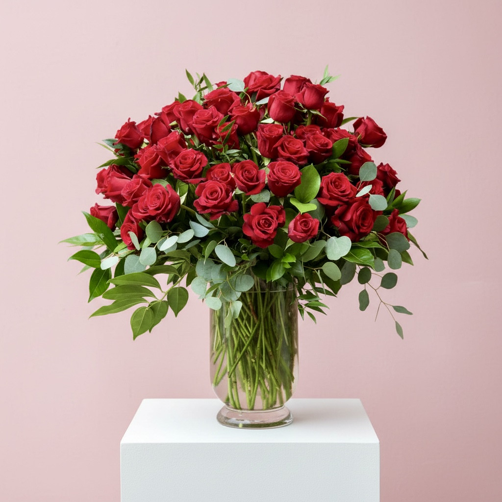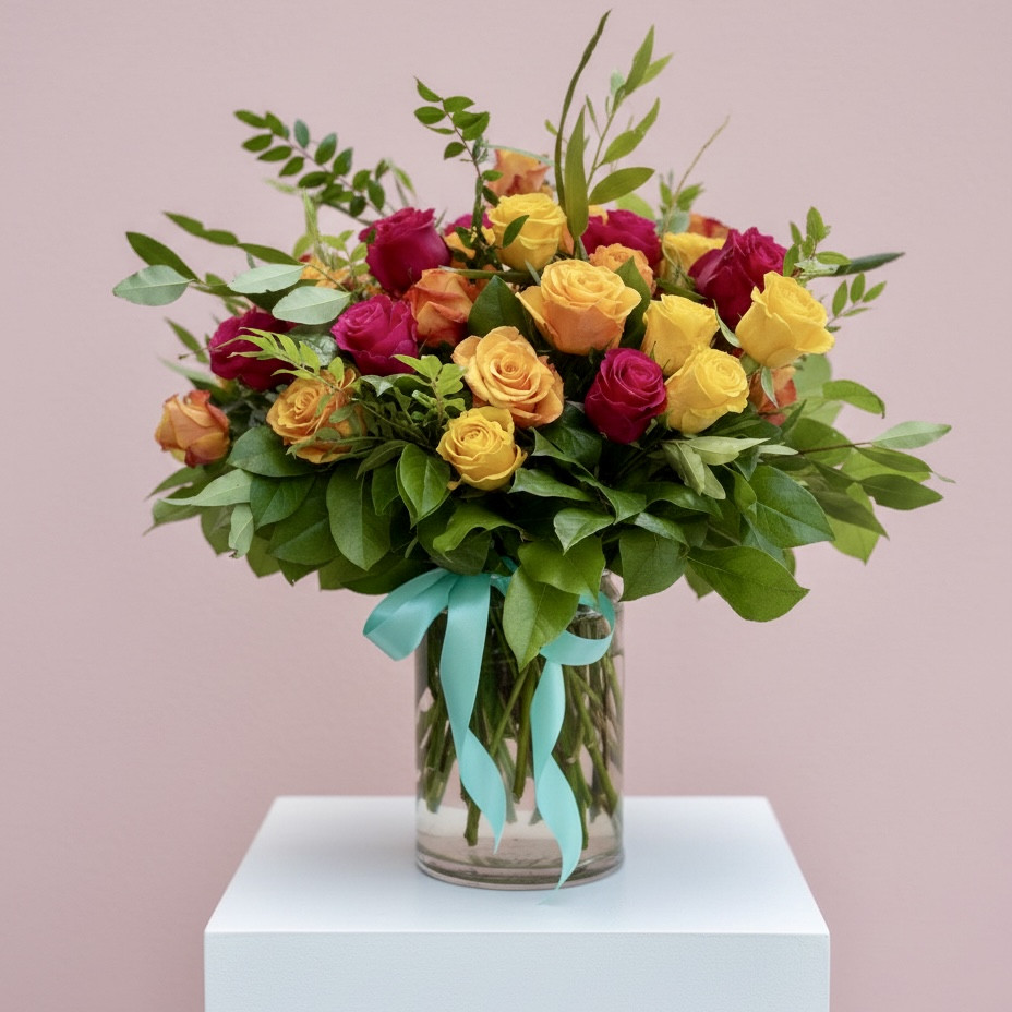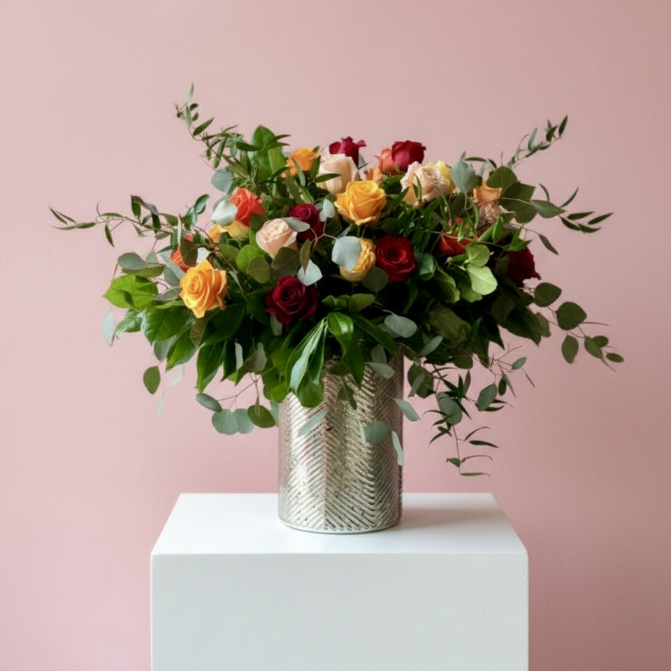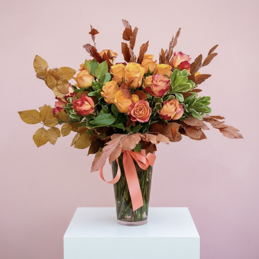 A bouquet of premium roses with seasonal accents and foliage.