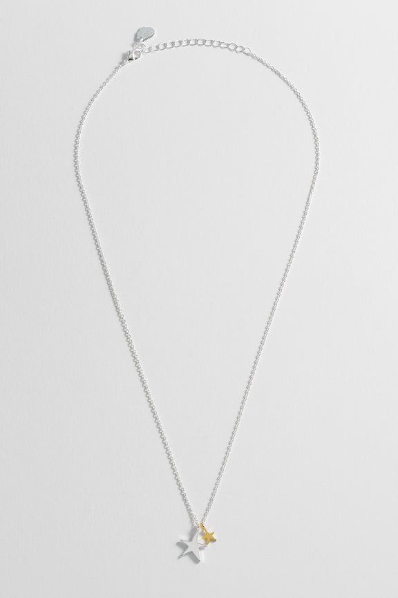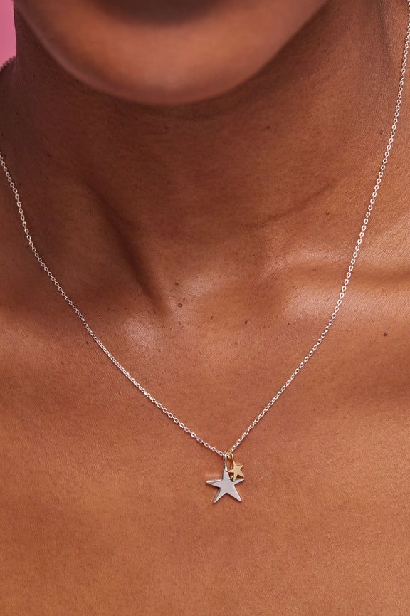 This delicate piece features a silver plated star alongside a smaller gold plated star.  This stunning Silver and Gold Star Necklace will perfectly accessorize your outfit and can be worn day or night. Treat your loved ones to this delicate silver and gold star necklace.